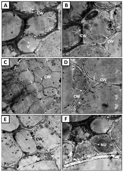 At the root level, healthy plant roots showed a regular, cohesive, and thickened cell wall that contained cytoplasm inside the nucleus, mitochondria, and the rest of the cell’s organelles were not affected (Figure 10A,B). On the contrary, it was found that the cell wall of the infected plants was broken and irregular (Figure 10C,D), indicating the lack of coherence and harmony of cell organelles, the decomposition of the nucleus and the disappearance of the cytoplasm. These pathological observations agreed with [101,102], who found that cells of infected plants show elongated deformation and decomposition of the nucleus. Further, in the roots of plants treated with A. fumigatus (Figure 10E,F), many differences were observed for the infected plant, where a cohesive and thickened cell wall and the presence of its nucleus inside the cytoplasm were observed. Treatment with A. fumigatus improved plant response to the resistance against the invasion of pathogenic fungi by increasing the thickness of the cell wall and, thus, preventing pathogen penetration. This increase in thickness occurs as a result of the sedimentation of substances that are difficult to penetrate by fungi, such as lignin; thus, this thickening wall limits or progresses the pathogen or prevents its advancement [103].