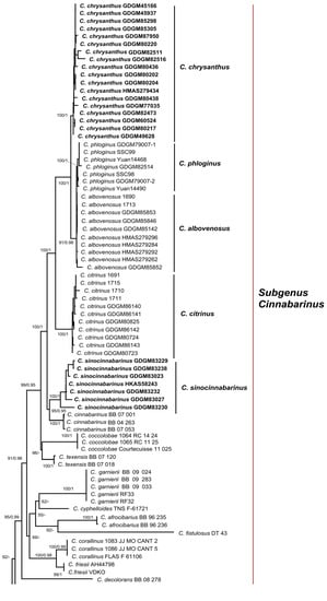 | C. cinnabarinus | BB 07.053 | USA | KF294630 | GQ914984 | KF294705 | [32] |