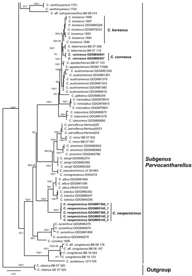 The authors sincerely thank the editors and anonymous reviewers for their efforts and contributions towards this manuscript. Sincere acknowledgments are expressed to the curators of the HMAS and HKAS for loan of the research specimens; to B. Bart (Muséum National d’Histoire Naturelle) for providing the sequences of Cantharellus koreanus; to W.Z. Ma (Kunming Institute of Botany, Chinese Academy of Sciences) and Z. Du (Institute of Microbiology, Chinese Academy of Sciences) for their assistance during the loan of specimens; to X.Y. Chen, Z.H. Zhang, and Y. He for the collaboration in the field.