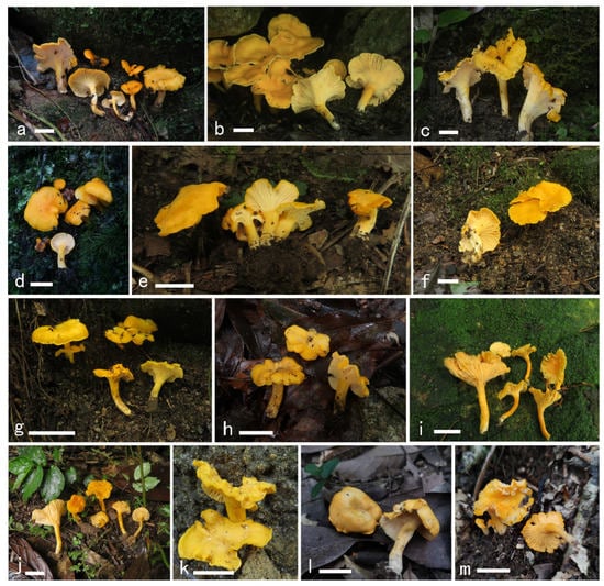 - Zhang, Y.Z.; Liang, Z.Q.; Xie, H.J.; Wu, L.L.; Xue, R.; Zeng, N.K. Cantharellus macrocarpus (Cantharellaceae, Cantharellales), a new species from tropical China. Phytotaxa 2021, 484, 170–180. [Google Scholar] [CrossRef]