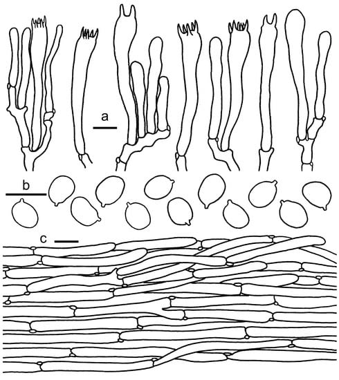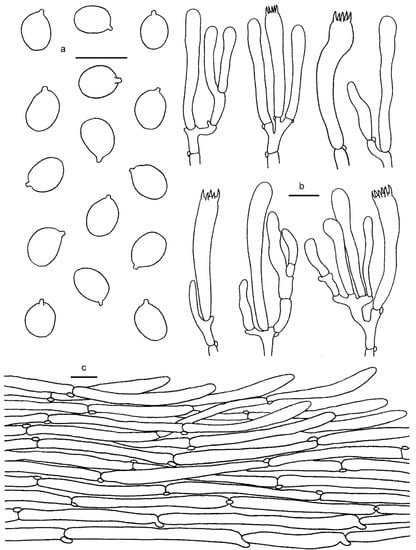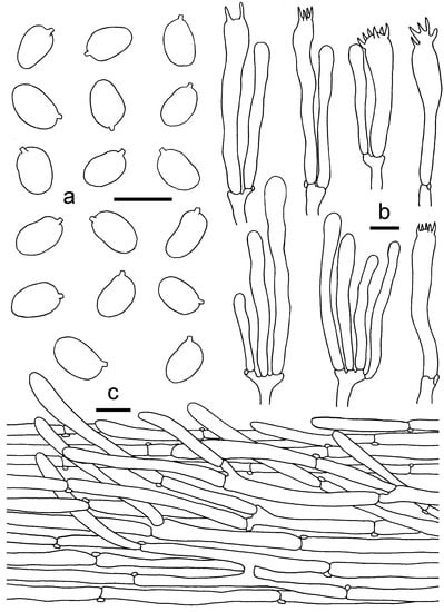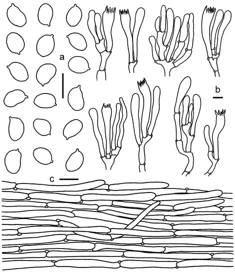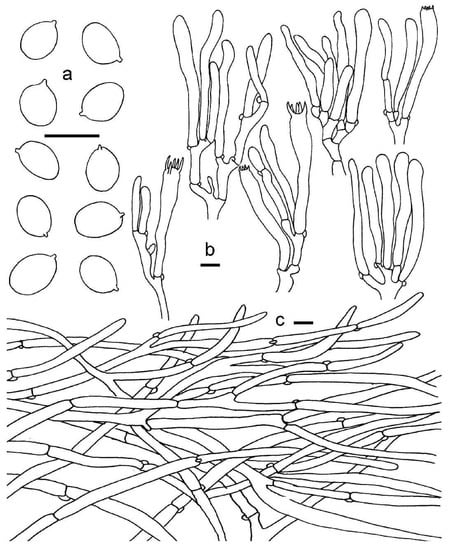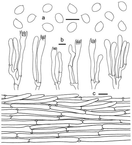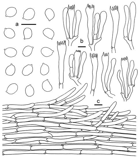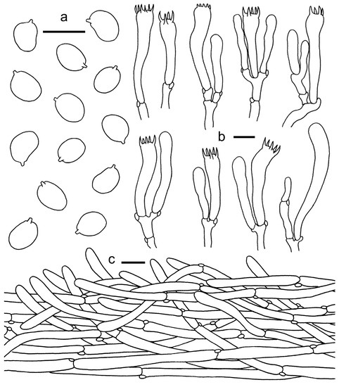 Cantharellus koreanus. (a) Basidiospores. (b) Basidia, basidiola and elements of the subhymenium. (c) Pileipellis. Bars: (a, b) = 10 μm; (c) = 20 μm.