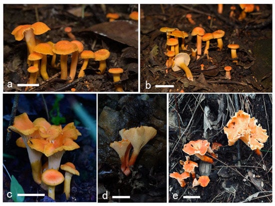 - An, D.Y.; Liang, Z.Q.; Jiang, S.; Su, M.S.; Zeng, N.K. Cantharellus hainanensis, a new species with a smooth hymenophore from tropical China. Mycoscience 2017, 58, 438–444. [Google Scholar] [CrossRef]