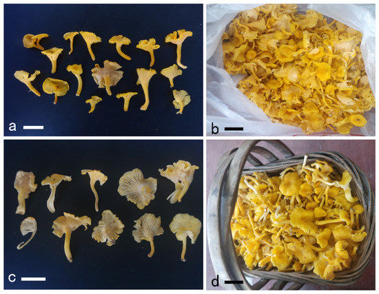 Basidiomata of Cantharellus koreanus. (a,b) GDGM79233. (c,d) GDGM85306. Bars = 2 cm.