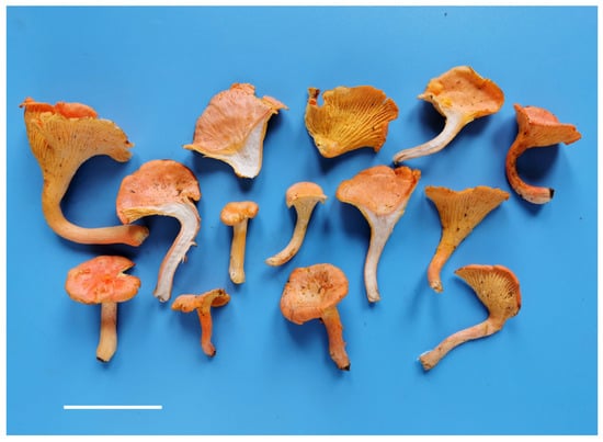 Cantharellus Fr. was firstly described by Fries [1] based on the type species Cantharellus cibarius Fr. Most Cantharellus species are popular edible mushrooms, especially beloved in Europe. Cantharellus is an ectomycorrhizal genus, forming symbiosis with various plants, such as the trees of Fagaceae, Pinaceae, Betulaceae, Salicaceae, Juglandaceae, Leguminosae, etc. [2,3,4,5,6,7,8]. Species in Cantharellus are widely distributed and are especially rich in subtropical to tropical zones [3,9,10]. Up to now, about 300 species of Cantharellus have been reported worldwide [7]. However, the species diversity is poorly known in Asia in the past decades, and many specimens were named after European or North American species [6,11,12,13]. In recent years, some new species were reported from Asia based on the combination of morphological characters and DNA phylogenetic analyses [6,7,11,12,13,14,15,16]. Recent phylogenetic studies demonstrated that Cantharellus is monophyletic and forms a sister relationship with Craterellus Pers. [3,4,7]. Species in Cantharellus were divided into seven subgenera based on multi-locus phylogenetic analyses in Buyck et al. [3], and a subsequent study in Cao et al. [7]. Cantharellus subg. Cinnabarinus Buyck & V. Hofst., typified by C. cinnabarinus (Schwein.) Schwein. was introduced for a monophyletic assemblage of mostly quite small, yellow, orange, pink or red species, sometimes mixed with lilac-purple or brownish tones in the pileus center, strongly veined in the lamellate hymenophore with principally thin-walled hyphal endings and abundant in clamp connections [3,17,18]. Species in subg. Cinnabarinus are widely distributed in Asia, Europe, North America, Australasia and Africa, and 16 species have been reported worldwide. In China, a large number of Cantharellus species have been reported, but only two species in the subg. Cinnabarinus were recorded, i.e., C. cinnabarinus and C. phloginus, by S.C. Shao & P.G. Liu. Cantharellus cinnabarinus, originally reported from North America, was recorded to be widely distributed in China [19,20,21]; C. phloginus was described as being from southwestern China [22].