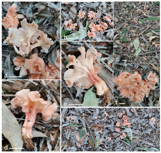 - Shao, S.C.; Buyck, B.; Tian, X.F.; Liu, P.G.; Geng, Y.H. Cantharellus phloginus, a new pink-colored species from southwestern China. Mycoscience 2016, 57, 144–149. [Google Scholar] [CrossRef]