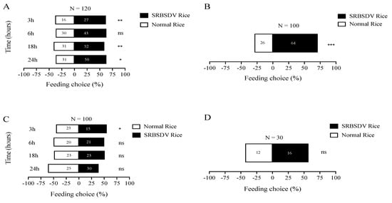 The rice virus SRBSDV is a serious plant virus, which could result in considerable yield losses of rice []. After its first report in Goungdong, China in 2008, the virus has spread into Japan and Vietnam, and has become one of the most important plant viruses for rice []. The rice planthopper S. furcifera is the unique vector of SRBSDV with a long-life transmitting ability. The occurrence of SRBSDV is related to the breakout of the S. furcifera population under field conditions []. Interestingly, this pest showed a feeding preference for those rice plants infected with SRBSDV, due to some specific odors []. Another insect pest, the whitefly, also showed a steady preference for Tomato yellow leaf curl virus-infected plants []. The preference of vectors would enhance the probability of the virus to enter uninfected hosts, and eventually benefit the virus’ spread among the plant community [,]. However, we found that the feeding preference of S. furcifera for certain target plants disappeared at 48 h post-inoculation.