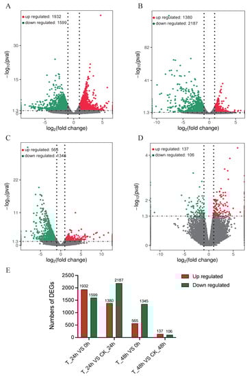 The volcano plot and numbers of differentially expressed genes (DEGs) of S. furcifera identified after M. anisopliae inoculation. (A) The volcano plot of DEGs at 24 h post inoculation vs. 0 h; (B) the volcano plot of DEGs at 24 h post inoculation vs. 24 h control; (C) the volcano plot of DEGs at 48 h post inoculation vs. 0 h; (D) the volcano plot of DEGs at 48 h post inoculation vs. 48 h control; and (E) the number of S. furcifera DEGs during M. anisopliae infection from 0 to 48 h.