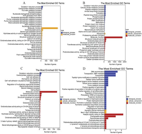 To examine the functions of the DEGs after M. anisopliae inoculation, we used the GO databases to map them. Specifically, after 24 h inoculation, the biological function category was assigned to 2008 DEGs (Figure 3A) compared with 0 h, and the biological function category was assigned to 2084 DEGs with the control after 24 h (Figure 3B). By contrast, the biological function category was assigned to 1107 DEGs (Figure 3C) after 48 h, compared with 0 h. However, the biological function category included 101 DEGs after 48 h with the control treatment, indicating different physiological responses of host S. furcifera to fungal infection over time (Figure 3D). Totally, the annotated GO terms included 5300 DEGs (2008, 2084, 1107 and 101 DEGs) in the BLAST database within the categories of biological process, cell component and molecular function (Figure 3A–D). For different periods, it also showed different abundance among the categories, and most of the DEGs were enriched in energy metabolism and antimicrobial activity during this period (Figure 3B,D).