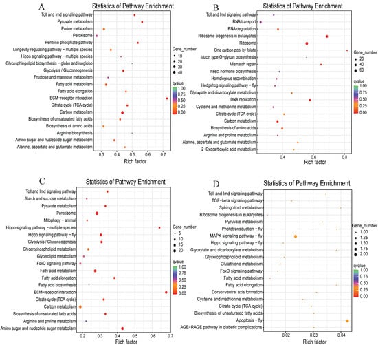 In this study, we also selected KEGG to identify the metabolic and signal transduction pathways associated with these DEGs. The DEGs were mapped to 133 pathways in the KEGG database between the blank control (0 h) and treatment groups at 24 h inoculation (Figure 4A), and 110 pathways were mapped in the KEGG database between the control and treatment groups at 24 h post-inoculation (Figure 4B). By contrast, the DEGs between the blank control (0 h) and treatment groups at 48 h post-inoculation were mapped to 107 pathways in the KEGG database (Figure 4C), and the DEGs between the control and treatment groups at 48 h post-inoculation were mapped to 25 pathways in the KEGG database (Figure 4D). The top 20 pathways of each group in the richness analysis were exhibited in Figure 4, majorly including the pathways of carbon metabolism at 24 h vs. 0 h and the pathways of ribosome and its biogenesis at 24 h vs. control. Meanwhile, we noted that many pathways were involved in the peroxisome, amino sugar and nucleotide sugar metabolism at 48 h vs. 0 h, and in apoptosis and the MAPK signaling pathway at 48 h vs. control. These pathways are important for maintaining the physiological functions of the host insect and for enhancing its response to pathogenic invasion.