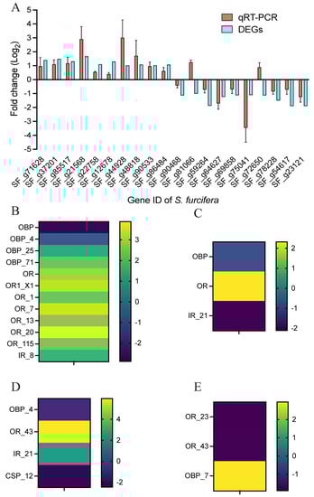Transcriptomic validation by qPCR and the olfactory-related genes identification. (A) A comparison of qPCR and RNA-seq of 20 genes; (B) the DEGs involved in the regulation of host olfactory behavior at 24 h vs. 0 h; (C) the DEGs involved in the regulation of host olfactory behavior at 24 h; (D) the DEGs involved in the regulation of host olfactory behavior at 48 h vs. 0 h; and (E), the DEGs involved in the regulation of host olfactory behavior at 48 h.