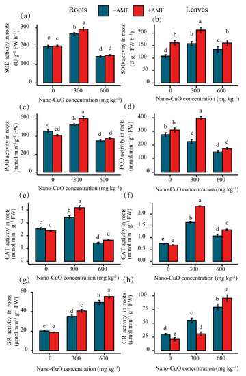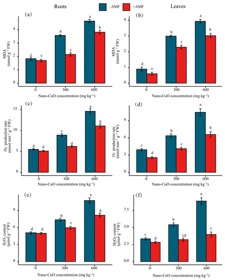4.2. AMF Led to a High-Efficiency ROS Scavenging Mechanism for the Protection of the C. indica Seedlings Exposed to Nano-CuO Stress from Oxidative Damage