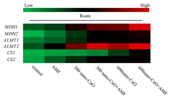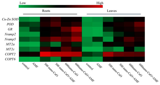 3.5. Impacts on Gene Expression Arising from AMF in Response to Nano-CuO Stresses
