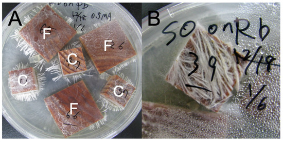 (A) Incubation of cube (C) and flat (F) wood blocks colonized by Resinicium bicolor (Rb) on Pholiota brunnescence (Pb) colony growing on 0.5% malt extract agar. (B) Cube wood blocks colonized by Scytinostroma odoratum (So) on Rb colony. Note that Rb hyphae grew out from wood onto the agar in (A), indicating a “win” of Rb, but Rb hyphae grew from agar onto wood blocks in (B), indicating a “loss” of So.