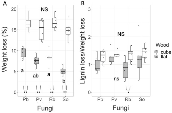 Weight loss (A) and lignin loss/weight loss (B) of wood blocks after 8-month incubation in pure culture of the four fungal species. NS and the same alphabets indicate no significant differences among fungal species in the post hoc Nemenyi test (uppercase, flat; lowercase, cube). Comparison between flat and cube blocks within a species was performed using the Wilcoxon rank sum test (*, p < 0.05; **, p < 0.01). n = 6.