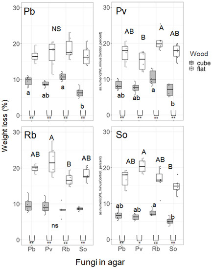 After the 3-month decomposition trials in pure culture, all fungal species exhibited more than doubled weight loss percentages in flat wood blocks (mean = 8.05%) compared to that in cube wood blocks (mean = 3.38%), and the differences between block types were significant in all species (Figure S2; p < 0.001, Wilcoxon rank sum test). The weight loss (%) of cube blocks was significantly larger in Pb and Rb than in So, but it was not significantly different among Pb, Pv, and Rb. The weight loss (%) of flat blocks was not significantly different among all strains.
