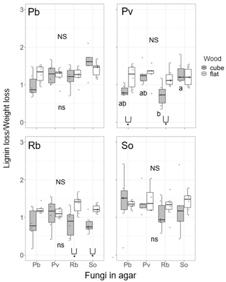 Compensatory decay acceleration might be more likely in the present study. Fukasawa et al. [20] reported accelerated decomposition in the competition of white rot basidiomycetes particularly in small wood blocks. Similarly, several previous studies have reported accelerated weight loss of wood and CO2 emission in the competition between wood decomposer basidiomycetes [13,14,15,44,45,46]. In the present study, the L/W of Pv cube was significantly smaller on Rb medium than on So medium (Figure 4), although the L/W of pure culture showed no difference among the four species (Figure 2). This is probably due to the shift of decay preference for carbohydrates to compensate carbon cost for competition rather than resource partitioning between fungal species. Chi et al. [47] also reported that co-cultures of the lignin-selective white rot fungi Ceriporiopsis subvermispora, Physisporinus rivulosus, Phanerochaete chrysosporium, and Pleurotus ostreatus suppressed lignin degradation compared to their monocultures and promoted the decomposition of hemicelluloses. It has been reported that even selective lignin decomposers increase carbohydrate decomposition compared with lignin decomposition under stressful conditions such as drought [48]. Although some upregulations of lignin-degrading enzymes, such as laccase, manganese peroxidase, and lignin peroxidase, were recorded in the interaction front of fungal colonies [49,50], it is likely that these enzymes are used for the production of pigments and removal of active oxygen species generated because of physiological stress rather than lignin decomposition [51].