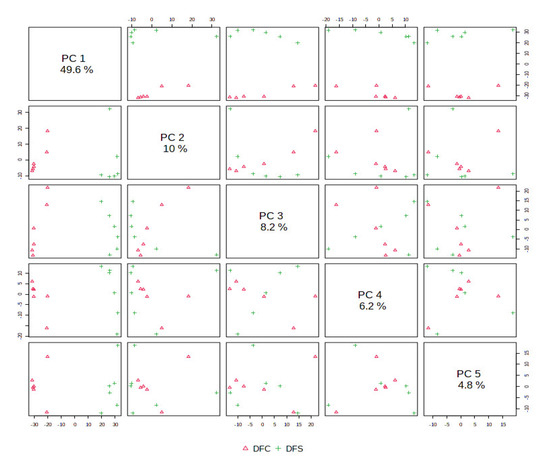 PCA pairwise score plot in unsupervised analysis of DFC and DFS. Different PCs illustrate variability in the spatial distribution of the sample groups.