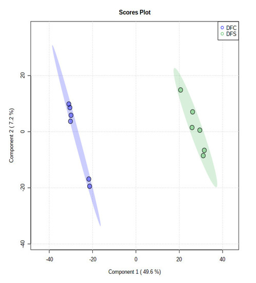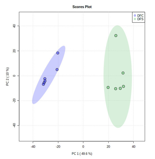 PLS-DA scores plot in supervised analysis. Predictive components 1 versus 2 showing the supervised separation between the two sample groups (DFC and DFS) based upon the culture supplementation.