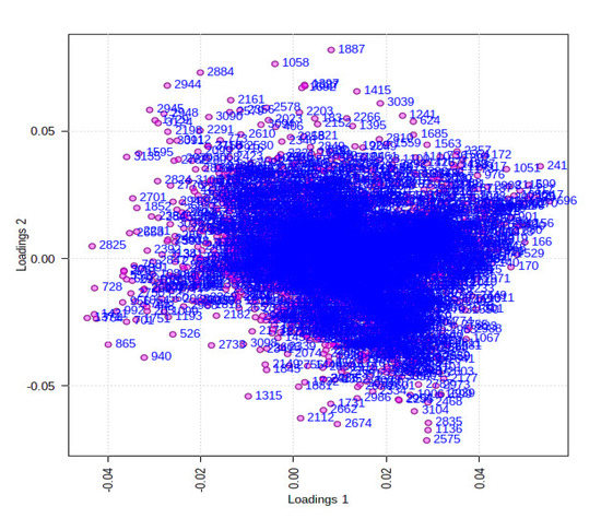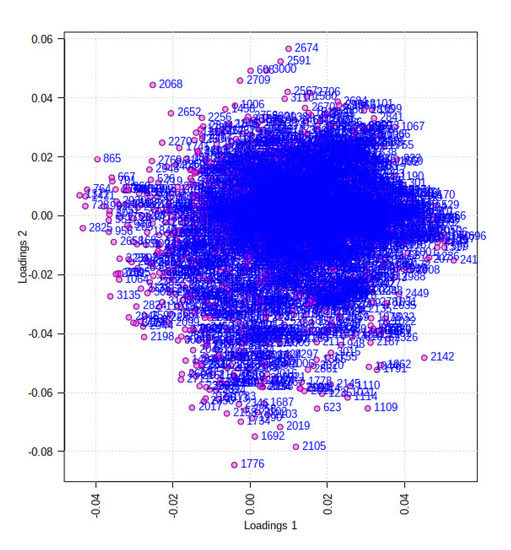 PCA loading plot in unsupervised analysis obtained from DFC and DFS. Shown data are the Var ID (peak number).
