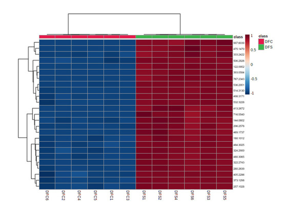 Dereplication of discriminant putatively identified metabolites in DFC and DFS. The level of identification was L2—putatively identified metabolites through library matching [23].