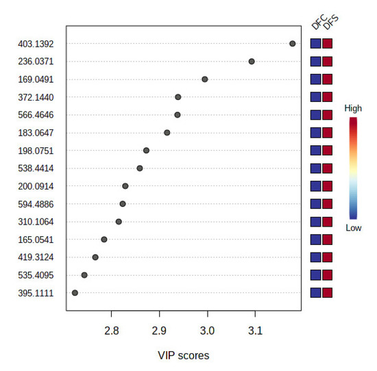 VIP score plot of the most important discriminant metabolites by PLS-DA for DFC and DFS. The relative abundance of each important metabolite is indicated with a colour code scaled from blue (low) to red (high). A high VIP score indicates a high impact of the metabolite as a discriminant feature among the sample groups.