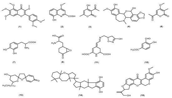 In supervised analysis, partial least squares-discriminant analysis (PLS-DA) is performed to distinguish biological samples within-group variation from between-group variation. It is a widely used supervised technique that integrates the extracted features and discriminants into one algorithm [44]. The accuracy, correlation coefficient R2 as well as the cross-validation correlation coefficient Q2 of the dataset were more than 0.8, suggesting good predictability of the model. PLS-DA 2D scores and loading plots are shown in Figure 7 and Figure 8. In PLS-DA scores plot, 56.8% of the total variations were explained by the two PLS components. The first and second components recorded 49.6% and 7.2%, respectively. In addition to that, PLS-DA established the 15 highest values of variable importance in projection (VIP) scores, as shown in Figure 9. The most 15 important features were shown on the vertical axis in an ascending order. These metabolites were dereplicated using METLIN and DNP to give 12 metabolites (Figure 10) and three unknowns (Table 2). The [M+H]+ ion peaks at m/z 403.1392, 236.0371, 169.0491 and 372.1440 suggested the presence of hexamethylquercetagetin (C21H22O8) (1), thioquinolactobactin (C11H9NO3S) (2), 3-acetyl-4-hydroxy-6-methyl-2H-pyran-2-one (C8H8O4) (3) and N-methyl-14-O-demethylepiporphyroxine (C20H21NO6) (4), respectively. Hexamethylquercetagetin was previously isolated as a new metabolite in Citrus plant [45], while thioquinolactobactin was found as a siderophore from Pseudomonas. This metabolite possessed significant antimicrobial activity with iron-chelating property [46]. 3-Acetyl-4-hydroxy-6-methyl-2H-pyran-2-one, also known as methylacetopyronone, was detected in the chloroform extract of Solandra nitida [47]. Meanwhile, N-methyl-14-O-demethylepiporphyroxine is an alkaloid previously found in Papaver somniferum. This medicinal plant contains various alkaloids with potent pharmacological and bioactive properties [48]. Vermopyrone (6), an α-pyrone, was first isolated from the fungus Gliocladium vermoesenii [49]. This metabolite was also present in Cephalotaxus hainanensis for anticancer activity [50]. Metabolite 2-amino-3-(3,4-dihydroxyphenyl)propanoic acid (7) is a catechol α-amino acid. Commonly, it is known as 3,4-dihydroxyphenylalanine and is used to treat Parkinson’s disease [51]. A [M+H]+ peak at m/z 200.0914 suggested the presence of α-amino-5-oxo-7-oxabicyclo[4.1.0]heptane-2-propanoic acid (anticapsin) (9). This metabolite was found to act as an inhibitor of glucosamine synthetase in Staphylococcus aureus [52]. Additionally, 12-decarboxy-4′,5′-dihydromuscaaurin I (11) was reported as a pigment from Amanita muscaria [53], while 5-acetyl-2-hydroxybenzaldehyde (12) was found as a new p-hydroxyacetophenone derivative from Senecro graveolens [54]. Metabolite aculeatin A (13) was isolated as a novel dioxadispiro[5.1.5.2]pentadeca-9,12-dien-11-one derivative from Amomum aculeatum. It showed a potent cytotoxic effect against KB cells and anti-protozoal activities on Plasmodium strains [55]. Interestingly, metabolite toxicol B (14) was previously isolated as a novel structure from the extract of Toxiclona toxius, which showed activity on human immunodeficiency virus type 1 (HIV-1) reverse transcriptase (RT) [56]. 3-O-Demethyldehydroamorphigenin (15) was previously isolated as a bioactive phenolic from the fruits of Amorpha fruticosa. Nonetheless, the metabolite exhibited weak antibacterial and cytotoxic activities [57]. The literature has reported that the fungal metabolomes depend on various experimental parameters. To date, there are various techniques to conduct metabolomics analyses to identify the fungal metabolites from the extracts [58]. Plant-associated fungal endophytes could produce bioactive metabolites that may be used as therapeutic agents against several diseases. The possibilities of discovering novel bioactive metabolites are exciting, particularly in unknown structures. Thus, searching for novel chemical skeletons from endophytic fungi is essential for the sustainable production of desirable natural products [7].