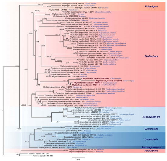 In this study, the generated phylogenetic tree comprises 74 species belonging to six genera (viz., Ascovaginospora, Camarotella, Coccodiella, Neophyllachora, Phyllachora, and Polystigma). We found that the Phyllachora genus is paraphyletic. Because the host of P. pomigena remains unknown, the species Phyllachora pomigena formed a single clade [20,51]. In the phylogenetic analysis, the new species described herein are included within the Phyllachora genus and separated from other taxa with a single subclade. Their hosts are Cenchrus flaccidus and Chloris virgata, both belonging to Poaceae (graminicolous).
