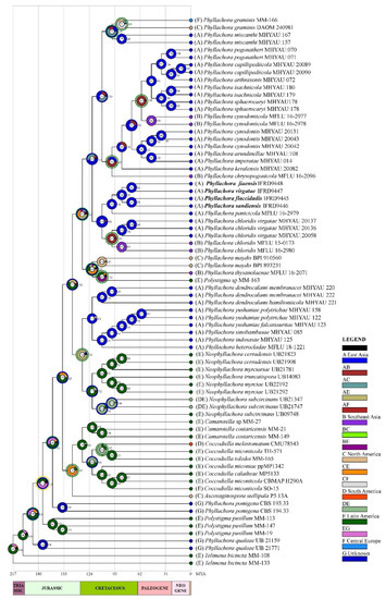 The second calibration time referenced the results of Dayarathne et al. [33] and Hongsanan et al. [43]. We followed the conclusion that the family Phyllachoraceae divergence time was about 217 Mya as a calibration point (root) for ancestral distribution reconstruction.