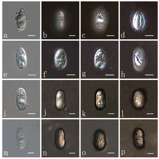 (a) P. flaccidudis ascospore in DIW (Deionized Water); (b,c) P. flaccidudis ascospores with gelatinous sheath in ink; (e) P. sandiensis ascospore in DIW; (f–h) P. sandiensis ascospores with gelatinous sheath in ink; (i) P. virgatae ascospore in DIW; (j,k) P. virgatae ascospores with gelatinous sheath in ink; (m) P. jiaensis ascospore in DIW; (n–p) P. jiaensis with gelatinous sheath in ink. Scale bars, (a–p) 5 μm. Microscopic techniques: DIC.