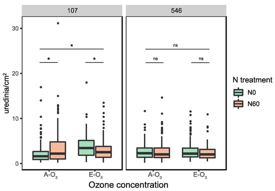 Rust severity of poplar foliar rust in four ambient ozone concentration FACE plots (A-O3) and four elevated ozone concentration FACE plots (E-O3) under two N treatments (N0 = no addition of nitrogen, N60 = addition of 60 kg/ha nitrogen every month). The significant differences between treatments at the 0.05 probability were indicated as the asterisk (*) according to the two-tailed Wilcoxon test; ns: not significant.