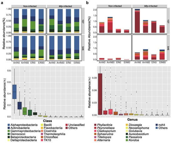 Taxonomic structures of phyllosphere bacterial microbiota at the class level (a) and fungal microbiota at the genus level (b). Only the 12 families with the largest mean relative abundance are shown.