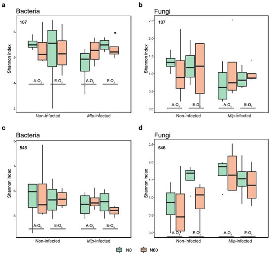 Shannon indices of phyllosphere communities of non-infected leaves and Mlp-infected leaves of the clone ‘107’ (a,b) and the clone ‘546’ clone (c,d) from ambient ozone concentration plots (A-O3) and elevated ozone concentration plots (E-O3) with nitrogen addition (N60) and without nitrogen addition (N0). Box plots showed the range of estimated values between 25% and 75%, the median, the minimum, and the maximum observed values within each dataset.