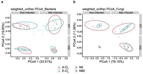 PCoA of bacterial and fungal communities using the weighted_unifrac distance for bacteria (a) and unweighted unifrac distance for fungi (b). Samples are sorted for ozone concentration (A-O3 vs. E-O3) and nitrogen treatment (N0 vs. N60).
