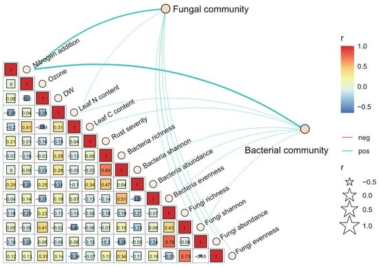 The Weighted Unifrac distance matrices for both bacterial and fungal communities were calculated and visualized using PCoA analysis. As expected, the leaf condition (non-infected vs. Mlp-infected) explained the largest part of variation in β-diversities of bacterial and fungal communities, 33.51% for bacteria and 79.15% for fungi, respectively (Figure S4a,b). The poplar clone (‘107’ vs. ‘546’) was the second-largest indicator interpreting bacterial and fungal β-diversity variation (Figure S4a,b). The clustering patterns of bacterial community under elevated O3 concentration and N addition were more pronounced for clone ‘107’ and which were clearly changed after infection of M. larici-populina (Figure 4a). Compared to bacterial community, fungal community was more affected by ozone elevation in both Mlp-infected leaves and non-infection leaves (Figure 4b). PERMANOVA analysis also showed that poplar clone and leaf condition significantly influenced phyllosphere microbiome (p < 0.05). Similar to the PcoA result, poplar clone and Mlp infection more strongly influenced phyllosphere fungal community composition (F = 7.656, p = 0.002; F = 5.693, p = 0.008) than bacterial community composition (F = 6.661, p = 0.001; F = 2.702, p = 0.023) (Table 1). Notably, elevated O3 concentration significantly influenced the fungal community composition (F = 3.684, p = 0.037) rather than bacterial community composition (F = 0.288, p = 0.973), particularly for the clone ‘107’ (F = 4.494, p = 0.020). Moreover, mental test was conducted for Mlp-infected leaves and the results suggested that nitrogen addition and leaf N content were the strongest environmental factors driving fungal and bacterial communities (Figure 5) and rust severity was positively related to nitrogen addition and ozone elevation, which in addition, negatively related to fungal community alpha-diversity, bacterial Shannon diversity but positively relatively bacterial community richness and abundance (Figure 5). Nitrogen addition and elevated O3 negatively related to both bacterial and fungal richness in Mlp-infected leaves (Figure 5).