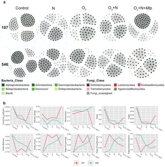 The co-occurrence networks (a) and trends of microbial network association indices (b) of phyllosphere microbiome for two hybrid poplars (‘107’ and ‘546’) in five conditions. No (a) biotic stresses (control), N addition (N), elevated O3 (O3), N addition with elevated O3 (N + O3), N addition, elevated O3 with Melampsora-larici populina infection (N + O3 + Mlp).