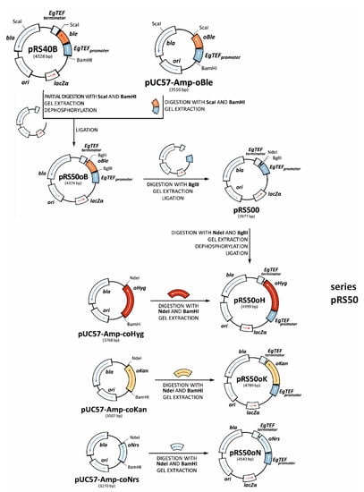 To facilitate transformation of various yeast species across the Saccharomycotina subphylum, which is likely to exhibit different tolerances towards different antibiotics, four integrative plasmids were constructed (named pRS50 series; Figure 3), each carrying one of four common antibiotic resistance markers used in yeast (geneticin G415, hygromycin B, nourseothricin, also known as clonNAT, and phleomycin). Steps in construction of the integrative plasmids is described in detail in Section 2.4.1. To be functional across the Saccharomycotina subphylum the antibiotic markers were codon-optimized and synthesized de novo. Namely, alongside species which use the convectional genetic code, the Saccharomycotina subphylum also includes yeasts belonging to the CTG clade, for example most species within the biotechnologically relevant Candida genus. In the genetic code of these yeasts, the CTG encodes serine instead of leucine [24]. Hence, all existing in-frame CTG triplets were replaced with synonymous ones encoding leucine. Moreover, the overall codon usage of antibiotic markers was optimized to match that of Candida albicans, which will ensure sufficient expression in the yeasts within the CTG clade [25]. In the design of codon-optimized markers, the introduction of restriction sites was avoided and other modifications were introduced with the intent to increase the level of expression. The arginine encoding triplet CGA which can cause premature translation termination in S. cerevisiae [26] was replaced with synonymous codons. The AAAA sequence was also inserted directly before the AUG start codon, as this was shown to increase the level of expression in S. cerevisiae [27]. Clearly, some of the introduced modifications are based on evidence for increased level expression in a single yeast species. Such modifications might also have a positive effect on level of expression in some other yeast species of interest, but this cannot be claimed in advance without experimental evidence. DNA sequences of modified codon optimized antibiotic resistance markers which were used in this work are given in Supplementary Figure S1. Each of the constructed integrative plasmids successfully conferred antibiotic resistance when tested in E. coli, thus demonstrating that redesigned makers retained their functionality. It is important to note that, for each new yeast species, the sensitivity to available antibiotics will have to be experimentally tested and then a plasmid carrying an appropriate marker can be chosen for transformation.