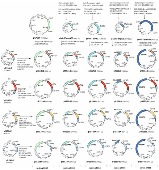 To construct a set of replicative plasmids, the following origins of replication were used: Saccharomyces cerevisiae 2μ plasmid origin [15], Kluyveromyces lactis panARS origin [16], Scheffersomyces stipitis SsARS2 origin [17], Merozyma guilliermondii MgALS123 origin [18] and Brettanomyces bruxellensis BbCEN2 origin [19]. Each of these origins was cloned in the backbone of all four yeast integrative plasmids, thus creating a set of 20 yeast replicative plasmids (series pRS52–pRS56). All steps in construction of replicative plasmids are shown in Figure 2.