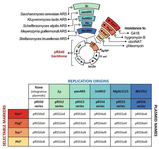 Schematic representation of integrative and replicative yeast plasmids constructed in this work and their names and main features. The pRS40 backbone carries sequences for selection and maintenance in E. coli (ori, bla) and other common vector features (LacZα, f1 ori), as well as TEF promoter (PEgTEF) and terminator (T) from Eremothecium gossypiii for expression of antibiotic selectable markers in yeasts. Codon usage optimized markers conferring resistances to geneticin G418 (KanR), hygromycin B (HygR), cloNAT (NarR) or phleomycin (PhlR) were cloned under the regulation of the TEF promoter thus creating four different yeast integrative plasmids. Additionally, in each of these plasmids, the following origins of the replications were cloned: 2μ form Saccharomycer cerevisiae, panARS form Kluyveromyces lactis, SsARS2 from Scheffersomyces stipitis, MgALS123 form Merozyma guilliermondii or BbCEN2 from Brettanomyces bruxellensis, thus creating a set of 20 replicative yeast plasmids.