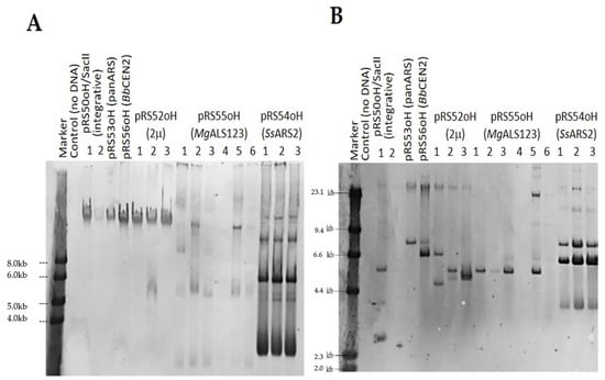 Perhaps most interestingly, in all three yeasts molecular analysis demonstrated that plasmid containing SsARS2 replication origin is maintained in circular form. This is in accordance with the fact that in these cases very high efficiencies of transformation were achieved (up to 4.7 × 105 transformants/μg; Table 4) which is comparable to efficiencies typically achieved when transforming model yeast Saccharomyces cerevisiae with replicative plasmid carrying its own origin (2μ or ARS). Moreover, the molecular analysis shows that in S. polymorphus var. polymorphus and S. polymorphus var. africanus plasmid carrying MgALS123 origin is also maintained in a circular form, which is also supported by high efficiency achieved during transformation with this plasmid (Table 3). However, colonies of transformants carrying plasmid pRS55oH (MgALS123) were relatively small and slow growing, while bands visible on Southern blot membranes are relatively pale, all indicating that this plasmid might not be as stable as pRS54oH (SsARS2) and, possibly, is frequently lost during culture growth.