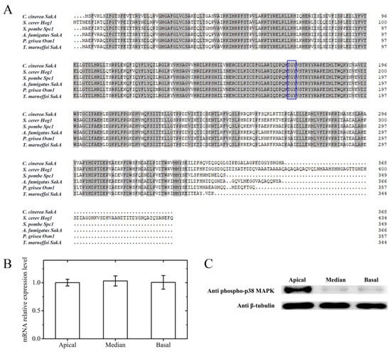 Based on the protein sequences of Hog1 (NC_001144.5) in S. cerevisiae and SakA (XP_752664.1) in A. fumigatus in the National Center for Biotechnology Information (NCBI) database, a putative homologue of the MAPK of the HOG pathway in C. cinerea (XP_001829398.2) was identified by BLASTP. The corresponding gene was named CcsakA (C. cinerea stress activated kinase A; Gene ID: 6005827; Gene symbol: CC1G_00577). CcSakA was described as a CMGC/MAPK protein kinase in GenBank. Homology analysis showed that the CcSakA protein sequence consisted of 368 amino acid residues and had 80.22% identity to SakA from A. fumigatus. Compared to Hog1 in S. cerevisiae, Spc1 in Schizosaccharomyces pombe, Osm1 in Pyricularia grisea, and SakA in Talaromyces marneffei, similarity among these MAPKs was extended along the entire polypeptide, including the conserved TGY phosphorylation site found in the stress Hog1/Spc1/p38 MAPK family (Figure 1A) [38,39]. In the fruiting body of C. cinerea, the relative mRNA expression level of sakA was not significantly different in different regions of stipe (Figure 1B). To detect whether the HOG pathway is activated during the fruiting body development of C. cinerea, protein extracts were obtained from the fast elongating apical part, the slow elongating median part, and the non-elongating basal part of the stipe and analyzed by Western blotting with an anti-phospho-p38 MAPK antibody. When the anti-phospho-p38 MAPK antibody was used to probe the phosphorylation of CcSakA, a strong band of approximately 43 kDa was detected in the apical part of the stipe, but the bands of the same size in the extracts of the median and basal parts were very weak (Figure 1C). The results showed that the expression levels of sakA in the different regions of stipe were not different. However, the phosphorylation levels of the protein were significantly higher at the apical part of stipe than that at the median and basal parts.