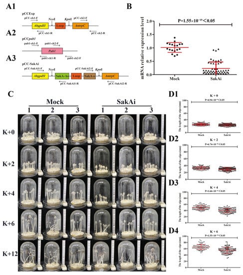 Construction and phenotypes of CcSakA gene-silenced strains. (A) Schematic representation of plasmids pCcExp (A1), pCcpab-1 (A2), and pCC-SakAi (A3). The arrows below the plasmids indicate the primers for genomic PCR. (B) The relative mRNA expression level of sakA in mock transformants (circle) and SakAi transformants (triangle). (C) Growing fruiting bodies of the three representatives of the mock transformants and SakAi transformants at different time points. (D) The stipe lengths of the fruiting bodies of four mock transformants (circle, n = 109 fruiting bodies) and eight SakAi transformants (square, n = 124 fruiting bodies) with at least three repeats of each transformant at K + 0 (D1), K + 2 (D2), K + 4 (D3), and K + 6 (D4).
