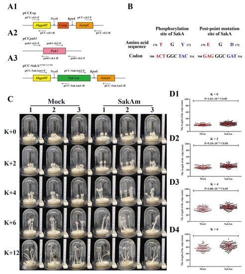Construction and phenotypes of CcSakA phosphomimicking mutant strains. (A) Schematic representation of plasmids pCcExp (A1), pCcpab-1 (A2), and pCC-SakAT170E+Y172D (A3). The arrows below the plasmids indicate the primers for genomic PCR. (B) Schematic diagram of SakA phosphorylation site mutations. (C) Growing fruiting bodies of the three representatives of the mock transformants and SakAm transformants at different time points. (D) The stipe lengths of the fruiting bodies of four mock transformants (circle, n = 123 fruiting bodies) and eight SakAm transformants (square, n = 131 fruiting bodies) with at least three repeats of each transformant at K + 0 (D1), K + 2 (D2), K + 4 (D3), and K + 6 (D4).