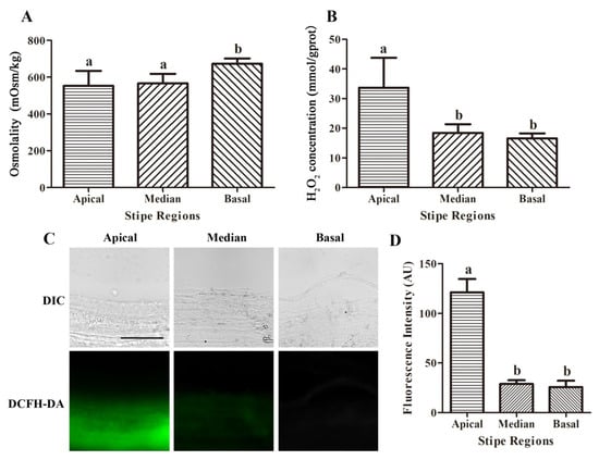 The osmolality (A) and H2O2 concentration (B) in the fast elongating apical part, the slow elongating median part, and the nonelongating basal part of the stipe of C. cinerea. Data are presented as the mean and standard error of three biological replicates (n = 6). The same letters indicate no significant difference (p > 0.05), and different letters indicate significant differences (p < 0.05) by Duncan’s test. The intracellular ROS imaging of the different regions of the stipe (C). The fluorescence signals of the fluorescent intracellular ROS probe DCFH-DA were observed and Bar = 50 μm. The fluorescence intensity (D) was analyzed by using ImageJ 1.51 (n = 9). The same letters indicate no significant difference (p > 0.05), and different letters indicate significant differences (p < 0.05) by Duncan’s test.