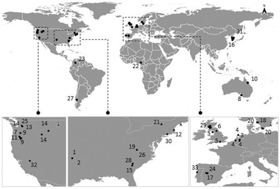 Map showing the geographic distribution of saprolegniosis reports in wild populations. Please see more information in Table 1. Numbers correspond to article reference: (1) Bragg and Bragg [71]; (2) Bragg [56]; (3) Strijbosch [21]; (4) Leuven et al. [22]; (5) Banks & Beebee [23]; (6) Beattie et al. [69]; (7) Blaustein et al. [43]; (8) Williamson & Bull [52]; (9) Kiesecker & Blaustein [44]; (10) Berger et al. [51]; (11) Kiesecker et al. [14]; (12) Gomez-Mestre et al. [41]; (13) Johnson et al.[31]; (14) Petrisko et al. [61]; (15) Ruthig [68]; (16) Kim et al. [67]; (17) Fernández-Benéitez et al. [48]; (18) Sagvik et al. [63,64]; (19) Ruthig [60]; (20) Uller et al. [65]; (21) Karraker & Ruthig [66]; (22) Blackburn et al. [24]; (23) Prada-Salcedo et al. [39]; (24) Fernández-Benéitez et al. [49]; (25) Ault et al. [46]; (26) Ruthig and Provost-Javier [57]; (27) Perotti et al. [59]; (28) Croshaw [75]; (29) Muir [70]; (30) Urban et al. [74]; (31) Groffen et al. [50]; (32) Sadinski, Gallant, and Cleaver [38]; (33) Costa et al. in prep. Maps made with QGIS. Location information available on Table S2.