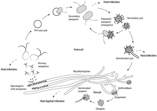 Adding to these facts, Saprolegnia sp. hold specialized structures and have evolved life cycle strategies that facilitate host colonization, potentiating their role as a pathogen. Saprolegnia sp. are capable of both sexual and asexual reproduction (Figure 3). Although it is not often reported in Saprolegnia spp., the sexual stage of the lifecycle is used to enhance survival and fitness during adverse environmental conditions, creating oospores that will germinate when conditions become more favorable [29]. On the other hand, asexual spores are assumed to be important in proliferation. The asexual spores are formed at the end of hyphal cells, the sporangia, which can release many motile zoospores. Usually, a decrease in available nutrients or a sudden drop in environmental temperature is known to trigger zoospore formation [89]. These primary zoospores swim for a short period; afterward, they encyst and release secondary zoospores that are motile for a longer period and are considered the main dispersion and infection structures that are responsible for saprolegniosis [88,90]. After new encystment, the cysts can release a new zoospore. This repeated zoospore emergence (RZE) and encystment is called “polyplanetism” [91].