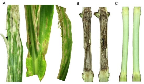 Conidia are disseminated by splashing and blowing raindrops to the neighboring maize plants and thus traverse only short distances; however, dried conidial masses are dispersed to longer distances through strong wind currents. Conidia are served as a secondary source of the C. graminicola inoculum. ASR/ALB is, therefore, a polycyclic disease, i.e., infections can occur multiple times during the growing season. The pathogen can infect all above-ground parts of corn (e.g., crown, stalk and leaves), causing ASR and ALB (Figure 1). Infected crop debris left over after the harvest serves as a primary source of the C. graminicola inoculum for the following maize crop. The pathogen can survive up to 18 months on the infected crop residues; however, mycelia and conidia can only survive for a few days on soil [15]. Acervuli burst through the epidermis of the infected crop debris in the next growing season, and if maize is planted again, conidia produced in acervuli infect plants, causing ALB and ASR. ALB is prevalent between the V2 and V12 growth stages, whereas ASR and top dieback occur during physiological maturity and the R4 growth stage onwards, respectively [13]. C. graminicola can also infect stalk through injuries caused by stalk boring insects, such as European corn borer (Ostrinia nubilalis) [16]. ASR leads to top dieback in which the upper internodes and leaves are killed during grain fill, causing significant grain yield reductions [10]. Further losses can occur during harvesting due to stalk lodging caused by breakage of the lower internodes [17].