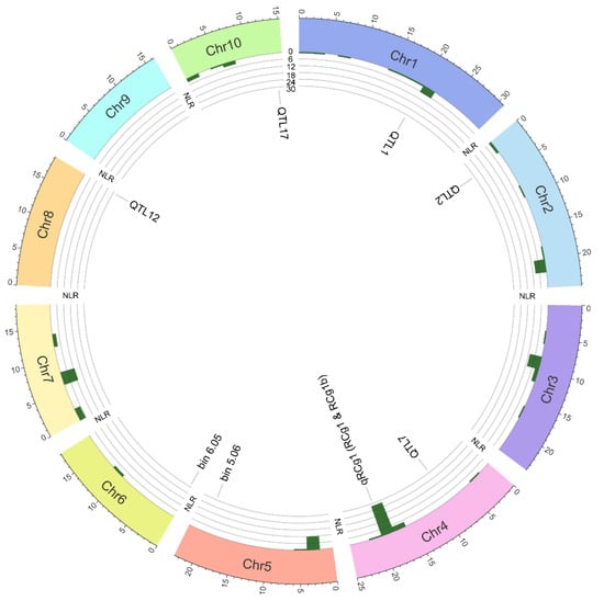 Figure 3. Circos plot exemplifying the distribution of 144 NLRs (encoding nucleotide-binding leucine-rich repeat resistance proteins) and QTL (conferring resistance to anthracnose leaf blight and stalk rot) in the Zea mays B73 genome. The outer track shows the Z. mays ideogram, comprising ten chromosomes (Chr1 through Chr10). The middle track consists of five circular ticks (6 NLRs/tick); the bars inside the track exhibit the frequency distribution of NLRs on the chromosomes. The inner track indicates the location of QTL based on their flanking marker positions listed in Table 1. The B73 genome lacks the QTL qRCg1 controlling resistance to anthracnose stalk rot; hence, its location on the B73 genome is relative to the marker UMC15a.