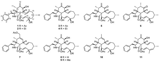 Compounds 8–11 were identified as cytochalasin H (8) [23], cytochalasin J1 (9) [24], RKS-1778 (10) [25], 21-acetoxycytochalasin J2 (11) [26] on the basis of their spectroscopic features and by comparison with the published data in the literature. Biogenetically, compounds 1–11 might be derived from a polyketide chain (octaketide) and an amino acid building block (phenylalanine) through a number of steps involving cycloaddition, oxidation, reduction, dehydration, acetylation, ethylation and methylation [27,28].