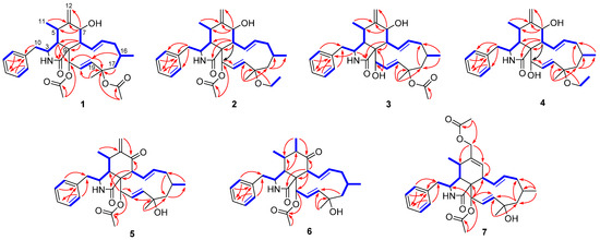 Key HMBC (red arrows) and 1H-1H COSY (blue bold) correlations of compounds 1–7.