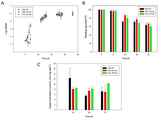 Next, we analyzed the consumption of glucose by cells as a measure of energy metabolism and growth. In agreement with the lack of effect on growth kinetics, the absence of one plasma membrane H+-ATPase did not affect glucose consumption by cells (Figure 1B). We found that cells grown in batch mode at 180 rpm entered the stationary phase at around 30–40 h of culture, when the optical density reached a value around 3.4 (Figure 1A). As expected from a fully respiratory microorganism without fermentation capacity, glucose in the culture media at the end of the incubation (72 h) was still high (between 50–60% of the initial glucose concentration) (Figure 1B), suggesting that the decrease in an essential factor, such as the dissolved oxygen, limited cell growth at high cell densities.